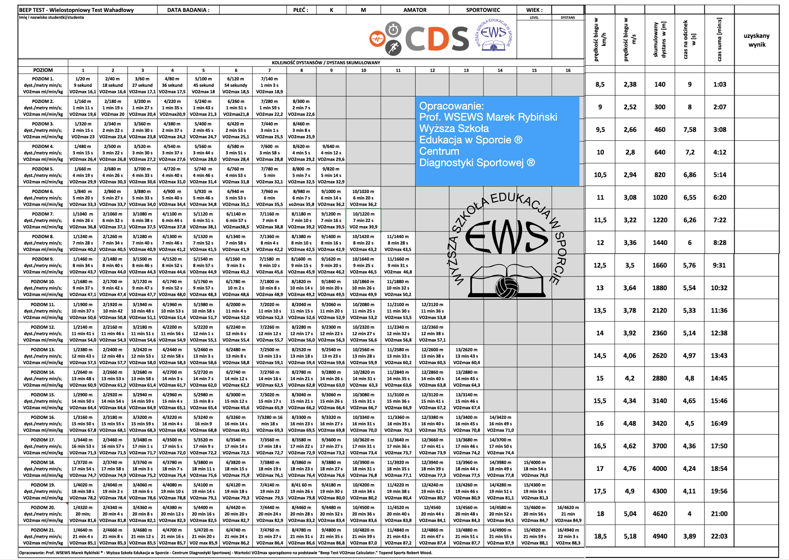 - Arkusz BEEP TEST - wersja PDF - do zapisu przebiegu testu oprac. Prof. WSEWS Marek Rybiński