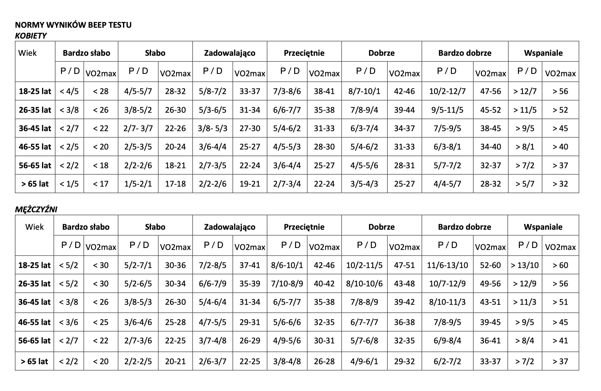 - Tabele i normy BEEP TESTU dla koiet i mężczyzn
